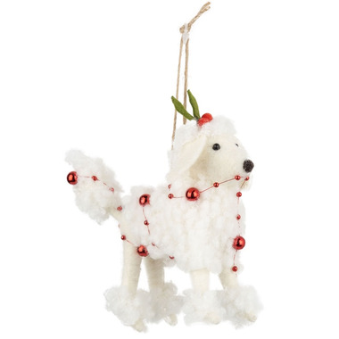 Silver Tree's felt poodle ornament is wrapped in red garland with a holly on her head - how festive!