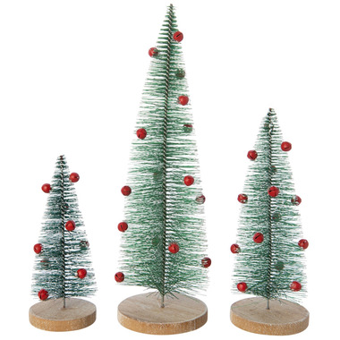 A charming trio of festive green bristle trees, each accented with bright red metal bases, bringing a whimsical splash of holiday cheer to any tabletop or display.