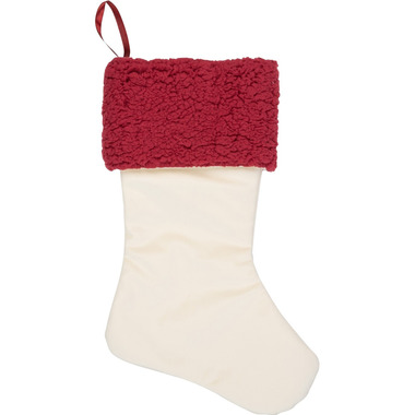 White Velour Stocking With Red Boucle Cuff, Loop For Hanging, approx 18 Inches