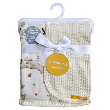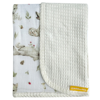 The Simmons Waffle muslin blanket combines the lightweight breathability of muslin fabric with textured, honeycomb-like pattern of a waffle weave. The waffle side is made from 100% cotton and the muslin side is made from rayon & bamboo. Muslin fabirc known for its softness and breathability.