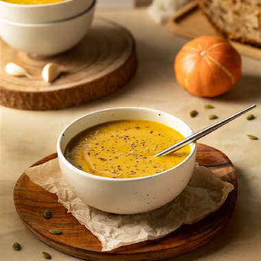 A delicious fusion of sweet, spice and everything else nice, this Curried Pumpkin Soup combines sweet yellow Pumpkin blended in with veggies, aromatics, and spiced up with pepper and a mellow Curry flavour. Warms you up, one sip at a time!