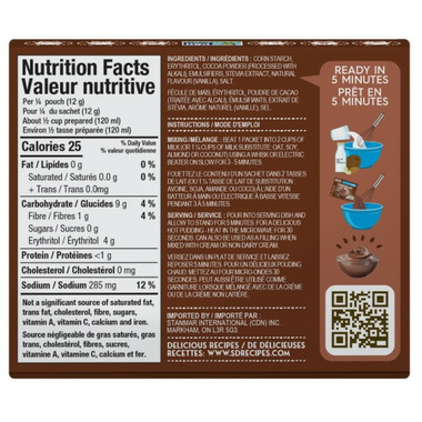 Mixing: beat 1 packet into 1 2/3 cups of milk (or 1 1/4 cup of milk substitute: almond, soy, coconut milk or other) using a hand held or electric beater for 2 minutes.Serving: pour into serving dish and allow to stand for 5 minutes. For delicious hot pudding – heat in microwave for 30 seconds. Can also be used as a filling when mixed with cream/non-dairy cream.