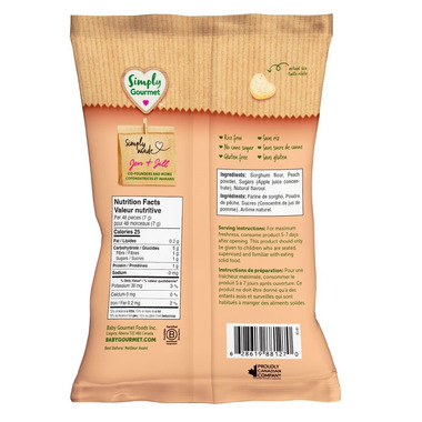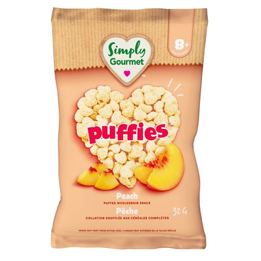 Simply Gourmet Peach Puffies are a puffed wholegrain snack.