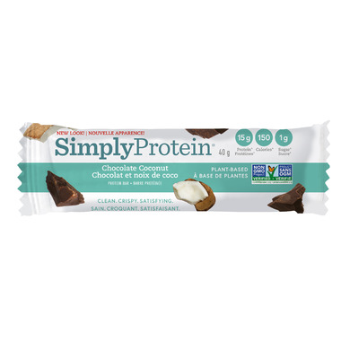 The Simply Protein Chocolate Coconut Bar contains 15 g of protein, only 1 g of sugar and is made from a short list of clean ingredients. The light, crispy texture works in perfect unison with the chocolate coconut combination. For chocolate lovers looking to honour their sweet tooth without loading up on sugar, this is the bar for you!