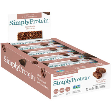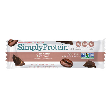 Simply Protein Bar Cocoa Coffee has a rich chocolate flavour with a coffee bite!  Keep this bar nearby when you are travelling, get an unexpected craving, or need nourishment before or after a workout.