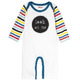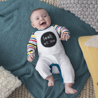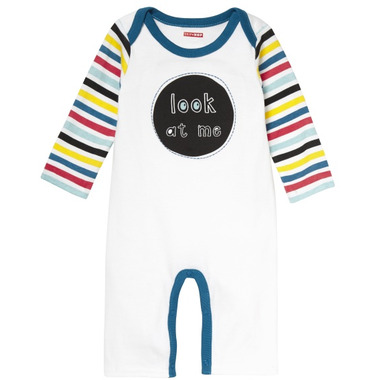 An all-in- one outfit that’s sure to command attention! All eyes will be on baby with this playtime-perfect romper! Featuring a bold “Look at Me” graphic, embroidered details and colourful, striped sleeves, this all-in- one layette piece is ideal for any little one who tends to steal the show. Lap shoulders and quick-snap buttons make changing a breeze, so baby can get back to scene-stealing in no time!