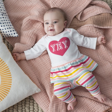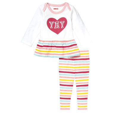 Put your hands together for this yay-worthy outfit! Just say “yay” to this girly two-piece layette, which set features a “Yay” heart graphic, embroidered details and colorful stripes. With a skirted tunic and coordinating leggings, it will quickly become a go-to outfit that’s equal parts comfy and adorable. Now that’s something to cheer about!