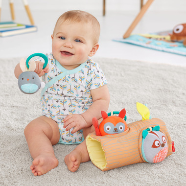 Skip Hop Camping Cubs Peek-a-Boo Ball Trio is perfectly sized for little hands; this animal trio rattles and chimes! Play hide and seek when they are placed in and out of the holes. This four piece set includes fun sounds, bold patterns, and textured leaves, making playtime fun at home or on the go.