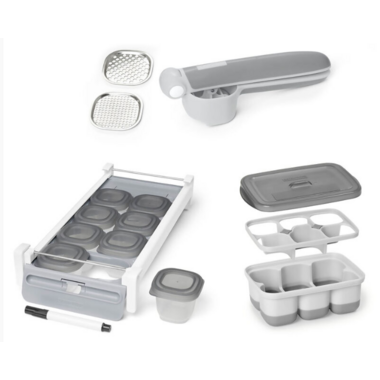 Infant feeding just got easier! this mealtime starter kit includes three essential time-saving tools all new parents need ASAP. Create your own fresh baby food with Skiphop food press baby puree maker, then store it in the sliding tray and baby food containers or freeze a fresh batch of baby puree for later in this freezer tray set—complete with a handy divider that creates 6 2 oz. servings.