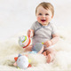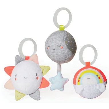 Skip Hop Silver Lining Cloud Ball Chime Trio makes your baby shake, rattle and roll! Each of these plush baby toys makes a chime sound along with its own distinct baby rattle sound when shaken, grabbed or rolled across the floor. Just the right size for little hands to hold, the sun, moon and rainbow offer multiple textures to explore and feature an attached loop for east transport. The forecast is fun!