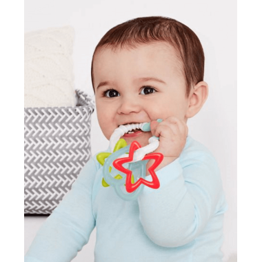 Rated 5 out of 5 by from My little guy loves this rattle/ teether combo. The top of the cloud has silicone on part of it to make it softer ( but still very firm) which is great for chewing on. The shape of the cloud also lends it self to fitting in to tiny mouths from many angles The stars have also been greater for learning to grab and chew on as well.