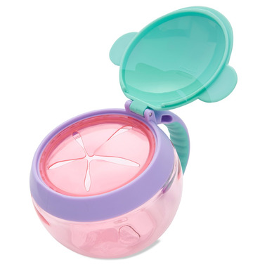 Perfect for toting munchies, this cute cup encourages independent snacking without the mess. The easy-grip handle is sized just right for little hands, and the snap top lid ensures food stays fresh. The flexible inside opening keeps snacks from spilling out - even if it's tipped over. With two lids there's less mess and mom's bag stays crumb-free!