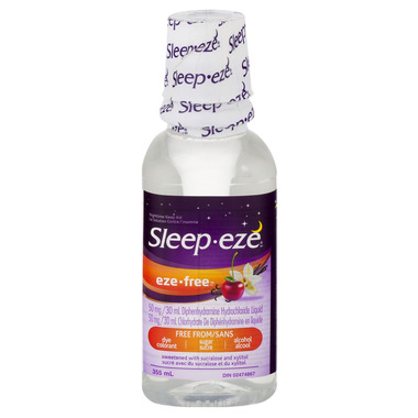 Sleep-eze Nighttime Sleep Aid. Eze freeΙ. Nighttime sleep aid. 50 mg/30 ml Diphenhydramine Hydrochloride Liquid. Free from Dye Sugar Alcohol. Sweetened with sucralose and xylitol. 355 ml.