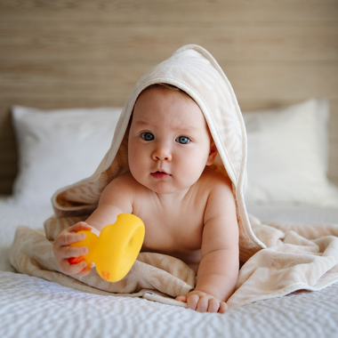 Crafted with a soft 370 GSM, this hooded kids' towel ensures a gentle touch on delicate skin. The exterior of this towel is a shaved cotton velour for a cozy hug-like feel. The towel's interior is an ultra-soft looped terry, providing ultimate absorbency without sacrificing comfort. Designed for comfort, this towel comes with a hood. The edges are reinforced with smooth cotton trim, enhancing durability for long-lasting use.
