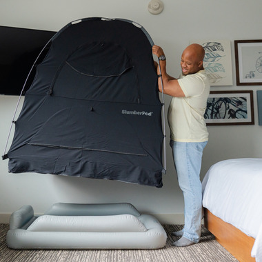 Drift off to dreamland with SlumberTot, the only inflatable toddler travel bed sized perfectly to work with the award-winning SlumberPod. Great for grandma’s, cousin sleepovers, vacation and more. SlumberTot’s cloud of comfort pairs a soft-touch sleep surface with integrated side rails for air-filled support and peace of mind wherever you may roam. Use on its own or with SlumberPod (sold separately).