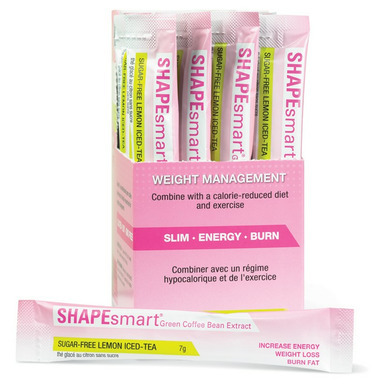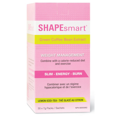The active ingredient in Smart Solutions Shapesmart is green coffee bean extract (Coffea canephora). Green coffee beans are known to support weight loss due to the levels of chlorogenic acid contained within them. Chlorogenic acid slows the release of glucose int the body after a meal, improves fat metabolism and decreases triglyceride levels. Shapesmart contains green coffee bean extract with a 45-50 percent concentration of chlorogenic acid making it more effective. SHAPEsmart comes in convenient individual powder packs with a great tasting lemon iced tea flavour that can be added to cold or hot beverages.