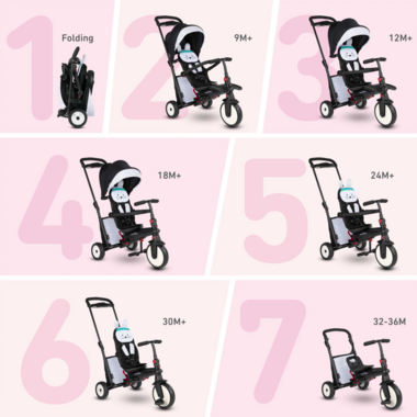 - Stage 7 (30-36M+): Supports Independence. Remove the high back support and close the parent handle. Little adventurers can continue their journey in exploring the outdoors on a fully independent toddler tricycle.