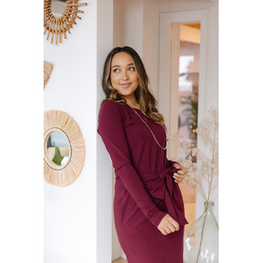 Featuring a crew cut neckline, long sleeves, and a front tie feature for a gorgeous midi wrap-style skirt, you’ll wonder how you ever lived without it!