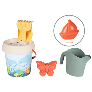 Innovative and environmentally conscious, that's the Smoby Life collection! The Smoby Life outdoor toys cleverly combine recycled material and high-quality new plastic granulate. The top priority is the safety of our little adventurers; a careful blend of materials ensures the perfect balance between stability and sustainability. This great Smoby Life bucket set with a colorful sea motif is ideal for beach vacations or the sandbox at home. Equipped with a sand bucket, watering can, removable sieve, rake, shovel and sand mold, lots of fun is guaranteed.