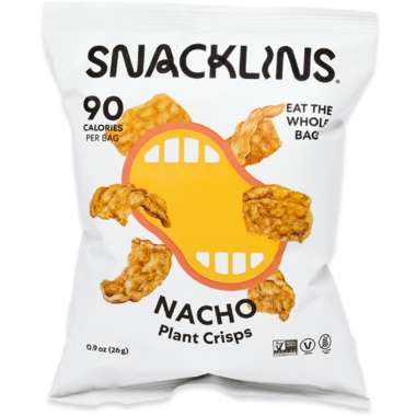 Snacklins Nacho Plant Crisps has 90 calories per bag and is Non-GMO, Vegan and Gluten Free.