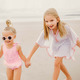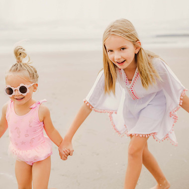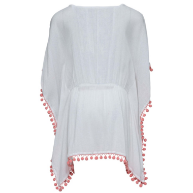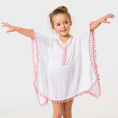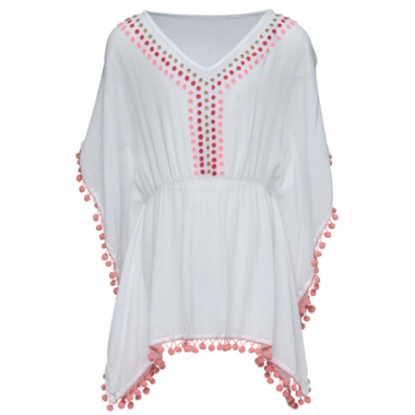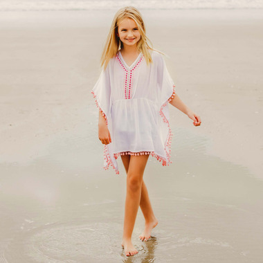 Picnics and playtime, our White & Dotty Cover up is perfect for throwing on after a day at the beach or pool. Featuring delicate gold and pink embroidery and pom pom trim, this cover up is favorite for girls of all ages.