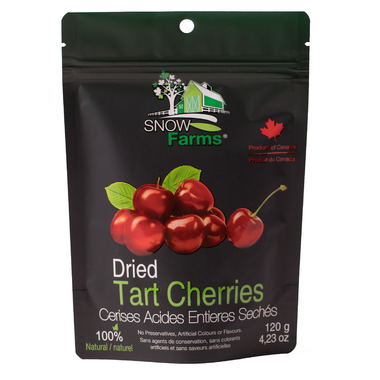 Snow Farms pure and delicious dried tart cherries are made with no added preservatives, colours or flavours. This simple convenient fruit is an idea snack time munch and adds special richness to your breakfast cereal.