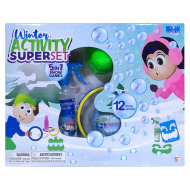 Includes: Crazy Ice Bubbles, 3 Snowball Maker, Snow Bottle Toss Mold, 6 Snow Ring Toss, 1 Snow Sprinkler, 3 Snow Sprinkler Colors, and Snow Monster Toss Form