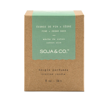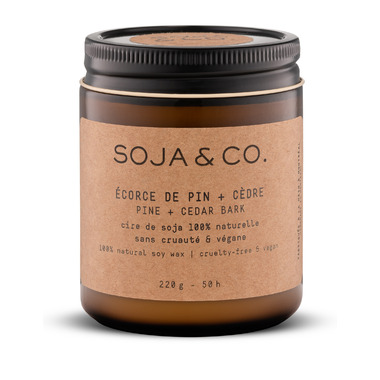 - Pine + Cedar Bark : This woody fragrance, SOJA&CO.'s single most popular, comforts you and transports you to the immensity of our Canadian forests, among century-old cedars and pines.