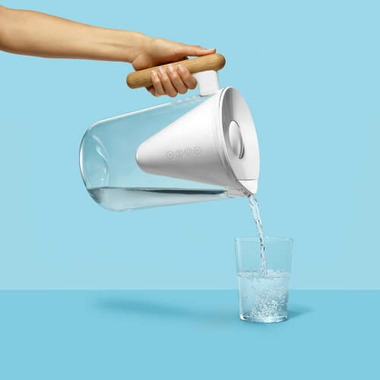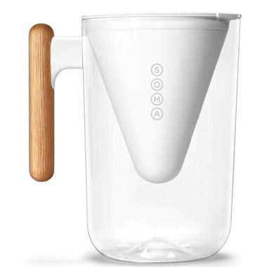 Soma Water Filter Pitcher holds 10 cups of filtered water. It is made of shatterproof, BPA-free plastic and has a white oak handle. Soma's filtration technology is made of 60% renewable, plant-based materials. Soma Replacement Filters available here.
