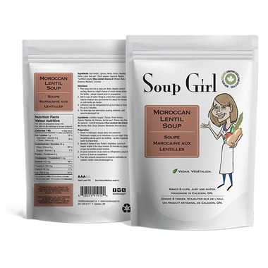 Soup Girl Moroccan Lentil Soup is now made with organic Canadian lentils and split peas. Makes 8 cups. Just add water. Handmade in Caledon, ON.