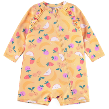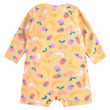 Yellow one-piece swimsuit with fruity prints, perfect for beach days. Features a round neckline and a front zipper for easy dressing. Adorned with ruffles on the sleeves for a feminine touch. Made from high-quality stretch fabric that offers UV50 protection, dries quickly, and resists salt and chlorine.