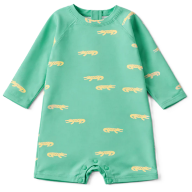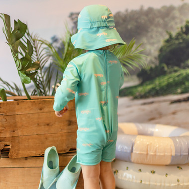 Turquoise one-piece swimsuit with crocodile prints, perfect for beach days. Features a round neckline and a back zipper for easy dressing. It also includes snap buttons at the crotch, making diaper changes easier. Made from high-quality stretch fabric offering UV50 protection, quick drying, and resistance to salt and chlorine.