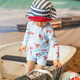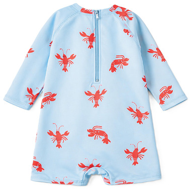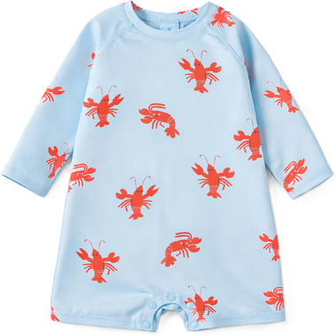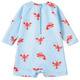Light blue one-piece swimsuit with lobster prints, perfect for beach days. Features a round neckline and a back zipper for easy dressing. It also includes snap buttons at the crotch, making diaper changes easier. Made from high-quality stretch fabric offering UV50 protection, quick drying, and resistance to salt and chlorine.
