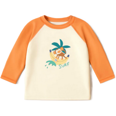 Cream and orange rashguard with a fun illustration of a monkey surfing on a banana! Features a contrasting round neckline and long sleeves. Made from high-quality stretch fabric that offers UV50 protection, dries quickly, and resists salt and chlorine.