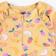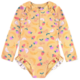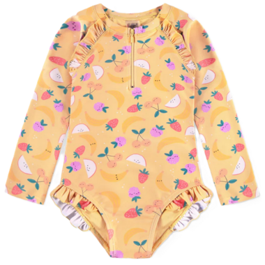 Yellow one-piece swimsuit with fruit all over print, featuring long sleeves for extra sun protection. Designed with a round neckline and a front zipper for easy dressing. Adorned with ruffles at the sleeves and hips for a feminine touch. Made from high-quality stretch fabric that offers UV50 protection, dries quickly, and resists salt and chlorine.
