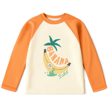 Cream and orange rashguard with a fun illustration of a banana! Features a round neckline and long sleeves. Made from high-quality stretch fabric that offers UV50 protection, dries quickly, and resists salt and chlorine.