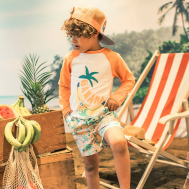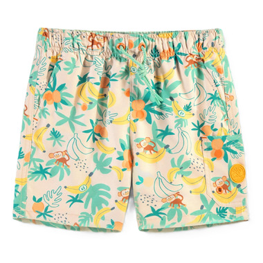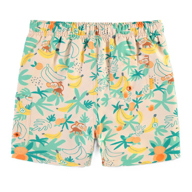 Beige swim bermuda with tropical prints, made from microfiber. Features front pockets, perfect for hiding little treasures! Includes an inner mesh lining for maximum comfort. Its high-quality fabric resists chlorine and salt and dries quickly. Elastic waistband and adjustable drawstring for maximum comfort.