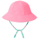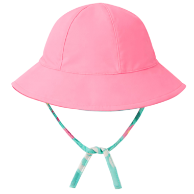 Reversible sun hat with one pink side and one turquoise side with floral prints. Made from high-quality fabric that resists chlorine and salt and dries quickly. You'll love the adjustable ties that help keep the hat securely in place, even on windy days.