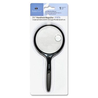 This handheld magnifier features a round, shatterproof, high-quality acrylic lens with a 2X main magnification and a 4X bifocal inset. Lightweight, one-piece moulded handle provides balance. Design also features black plastic frame and handle.