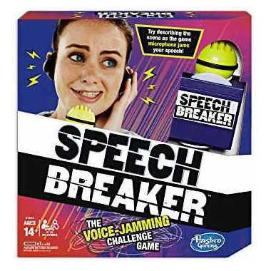 Can you overcome the voice-jamming challenge? You're reporting live from the scene! Put on the game headset, talk into the microphone, and get your teammates to guess who/what/where without saying any of the words on the cards. What's the catch? The microphone jams your speech with a built-in delay. As you talk, you'll hear your delayed voice through the game headset, making it harder to speak clearly. For example, how would you report that "an Alien is Swinging Kettlebells in a Glass House" without saying any of those words and in just 30 seconds with your speech jammed?
