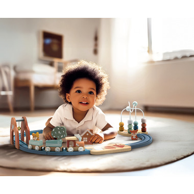 - Made from FSC-certified wood and finished with non-toxic, child-safe paints, it offers durable quality and peace of mind for parents. The set is designed for small hands, with easy-to-connect tracks and chunky play pieces that support fine motor skill development.