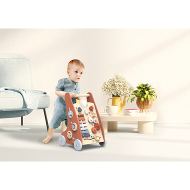 This wooden multi-activity walker allows the little one to gain confidence and balance when learning to walk.