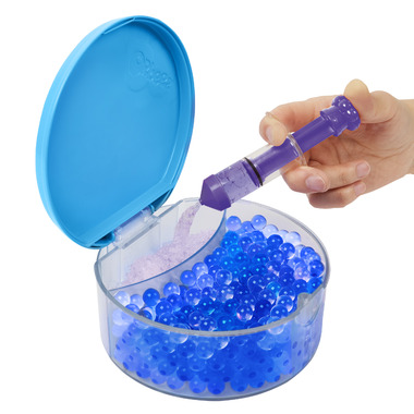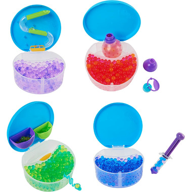 Introducing a new addition to the Orbeez craze, the Orbeez Activity Orb bundle pack! Unbox your bundle pack to reveal four mini-playsets, called the Flow, Bounce, Squeeze and Crush Playsets! Each activity orb in the bundle comes with 400 fully grown, Green, Blue, Purple or Pink Orbeez stored in their very own activity containers, with a hinged lids, so you can take them with you anywhere! After a really simple set-up, kids and adults can enjoy the soothing sensory experience of playing with these juicy gems and never be bored again! In the Flow Playset, use the scoop to send your Orbeez slipping and sliding down 2 ramps and 2 chutes, before bouncing into one of three numbered slots below. Earn 1, 2 or 3 points, based on where you land and see how many points you can score! The Bounce Playset features an Orbeez launcher, which you attach to the lip of the container, along with 2 numbered baskets that you snap onto the lid. Use the launcher to propel your Orbeez into one of the baskets and, depending on which basket you get, earn either 2 or 3 points for every basket made. In the Squeeze Playset, fill up a clear squishable pod with Orbeez, using the funnel accessory. Then, once full, use a ring topped cap to seal the Orbeez in the pod and begin squeezing and squishing away at your own stress ball! The fourth activity set is the Crush Playset, which is exclusive to this bundle and cant be found anywhere else. In this activity, load your bouncy water beads into an oversized Orbeez-Squisher to crush them into some goopy goodness that feels wonderful to the touch (Pod, funnel, Cap & oversized Orbeez-Squisher included ). Orbeez water beads encourage independent play and make the perfect arts and crafts activity gift for kids ages 5 and up, especially for those who enjoy sensory toys and as an alternative to modeling clay or slime kits!