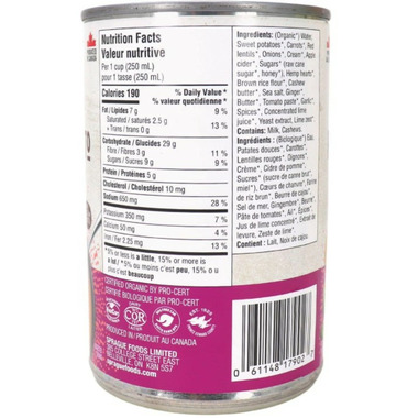 Water,Sweet Potatoes,Sprouted lentils,Carrots,Onions,Milk,Hemp hearts,Apple cider,Cashew butter,Sugars,Rice Flour,Butter,Ginger,Salt,Crushed tomatoes,Garlic,Spices,Concentrated lime juice,Yeast extract,Lime zest