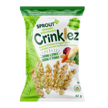 Sprout Organic crinklez popped chickpea & veggie snack cheddar & spinach. Made with real veggies. Sprout Organic Crinklez is a delicious veggie snack, made with plant powered chickpeas and popped with colorful carrots, spinach, and beets that you can see in every bite. Seasoned with real cheddar cheese, your toddler will love the savory taste of this fun crinkly, crunchy snack that brings delicious and nutritious together. Sprout Wholesome Snacking Made Fun!