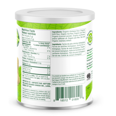 Organic Chickpea Flour, Organic Lentil Flour, Organic Rice Flour, Organic Corn Flour, Organic Sunflower and/or Safflower Oil, Organic Broccoli Powder, Organic Pea Fiber, Sea Salt, Organic Rosemary Extract to Maintain Freshness