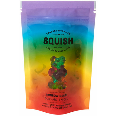 Squish Rainbow Bears Gourmet Candy, est 2014. Fruity-flavoured gummy candy.