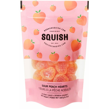 Squish Sour Peach Hearts Gourmet Candy, est 2014. Sour peach-flavoured gummy candy.
