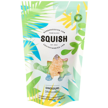 Squish Vegan Dinosours Gourmet Candy, est 2014. Dinosours are sour fruity-flavoured gummy candy. .