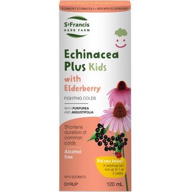 An alcohol free version of St.Francis Herb Farm Echinacea 2+ Kids, better tasting than ever with a touch of elderberry juice. Echinacea 2+ Kids with Elderberry harnesses the synergistic healing benefits of Echinacea purpurea and Echinacea angustifolia, two species blended together for optimal bioavailability and anti-infective power.